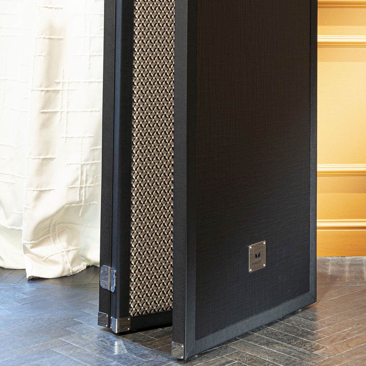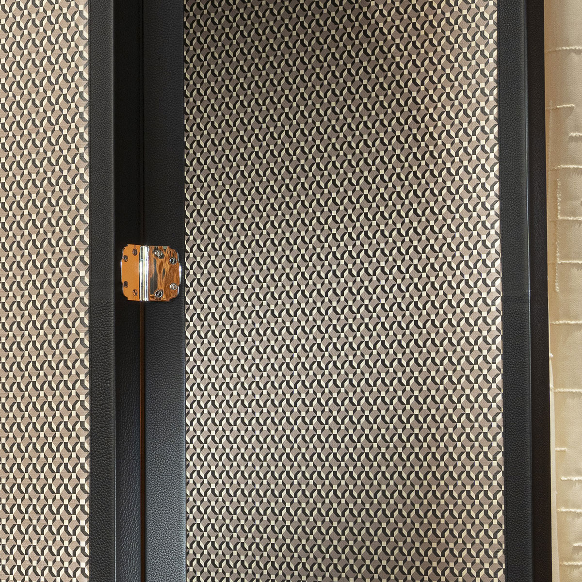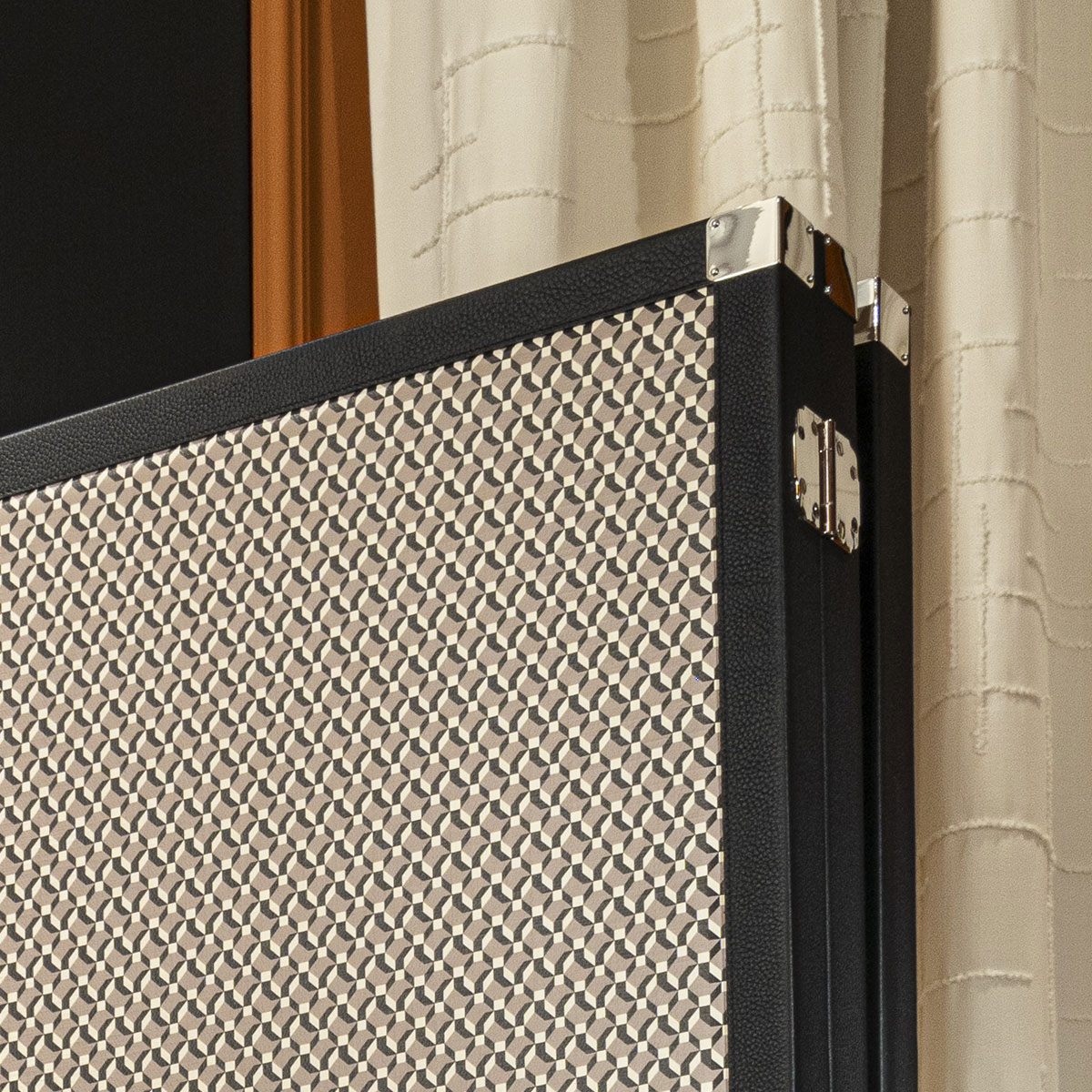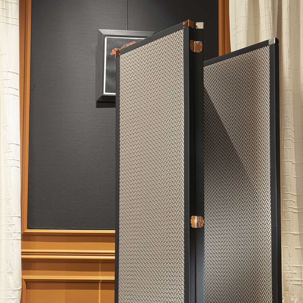 Screens from Baulette Collection made with Decogramma linen fabric by Dedar exclusively for Monschau Design Art, leather details and palladium finishing metal details.